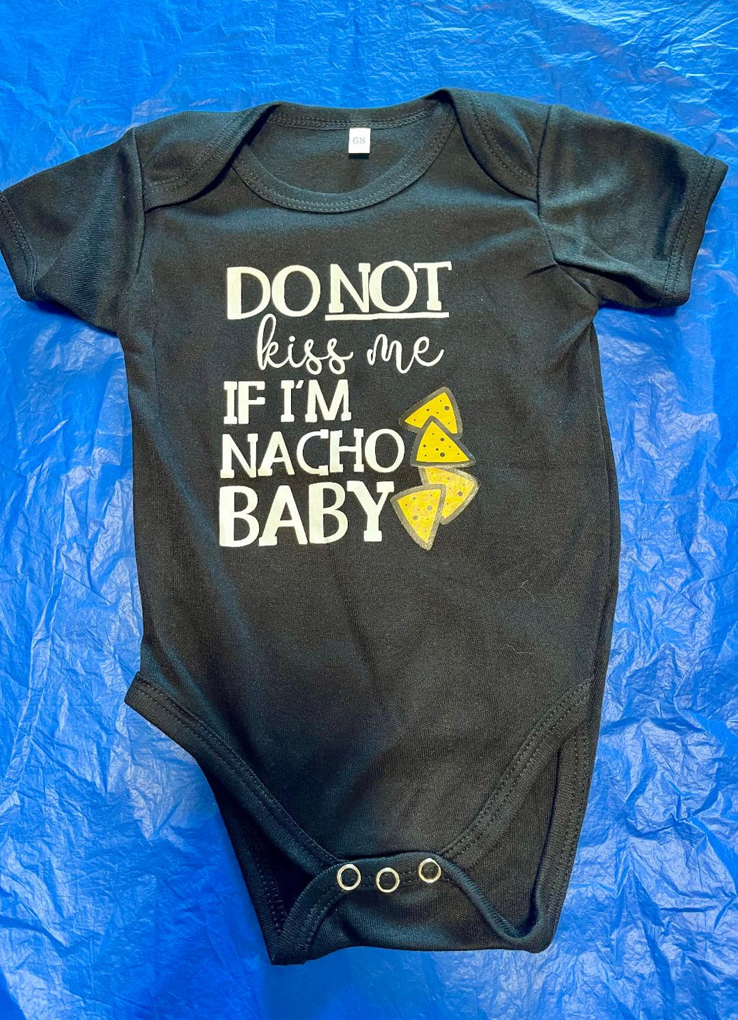 Black "Don't kiss me if I'm nacho baby" baby onesie for 6 MO